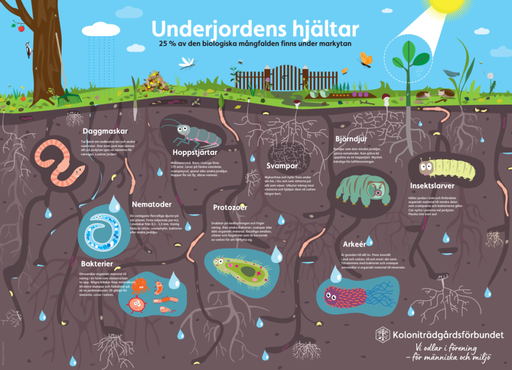 Lär er mer om daggmaskar, hoppstjärtar, nematoder, bakterier, protozoer, svampar, björndjur, arkéer och insektslarver. Ladda ner vår affisch, illustrerad av Mia Hillerhag.